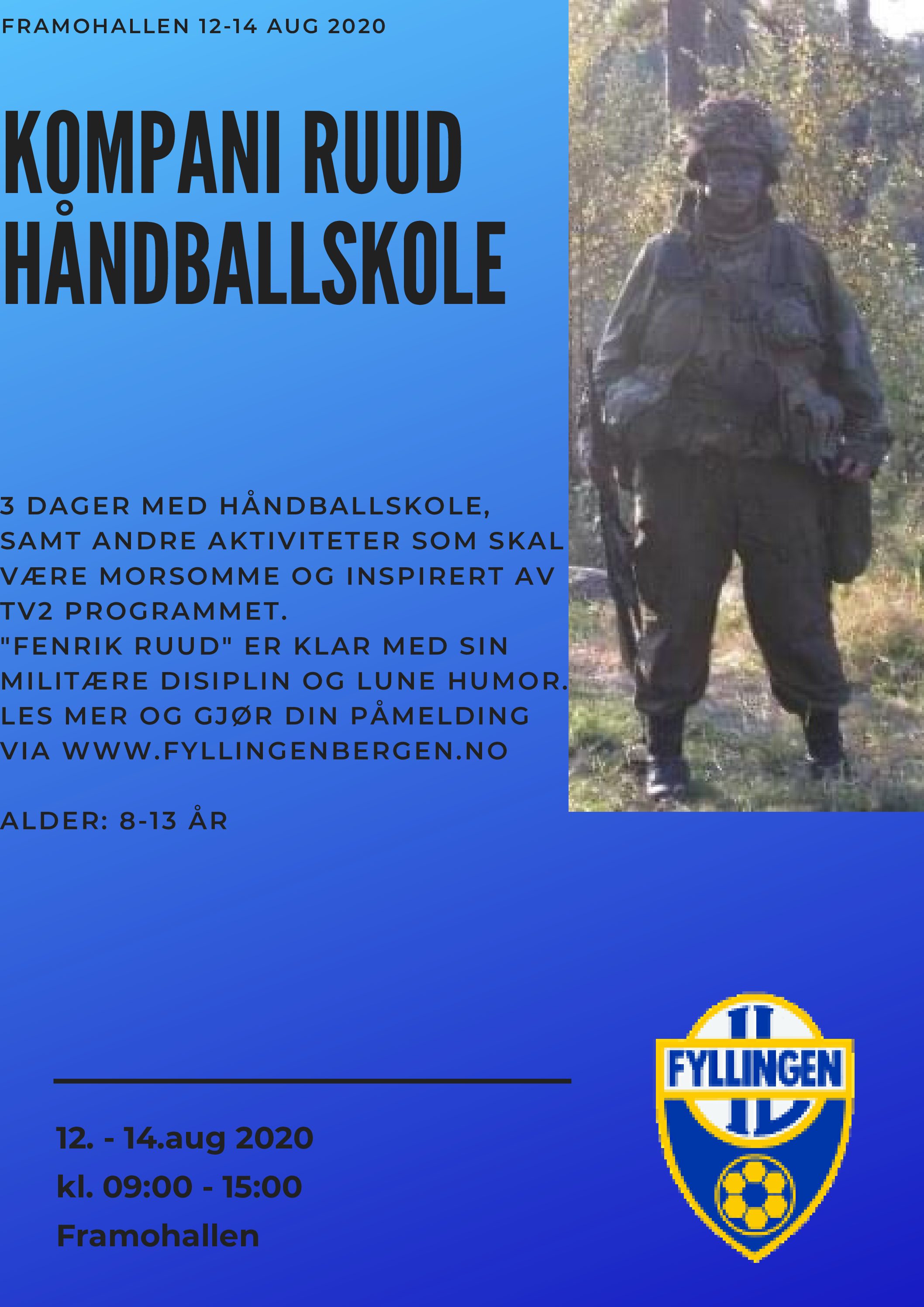 Anført av vår nye hovedtrener, Fredrik Ruud, har vi gleden av å invitere barn mellom 8 – 13 år til håndballskole i Framohallen 12-14 august. Den tidligere soldaten skal sammen med resten av FyllingenBergen spillerne ha tre dager med aktiviteter før skolen starter opp igjen. Det vil være håndball som primær aktivitet i løpet av dagen, men det ryktes at Ruud er inspirert av Fenrik Aker fra tv-serien, kompani Lauritzen. Det betyr at barna lærer seg avmeldingsrutiner og ikke minst disiplin. Det vil være konkurranser og praktiske oppgaver som til slutt gjør at vi kan få barna til å bestå kompaniskolen.