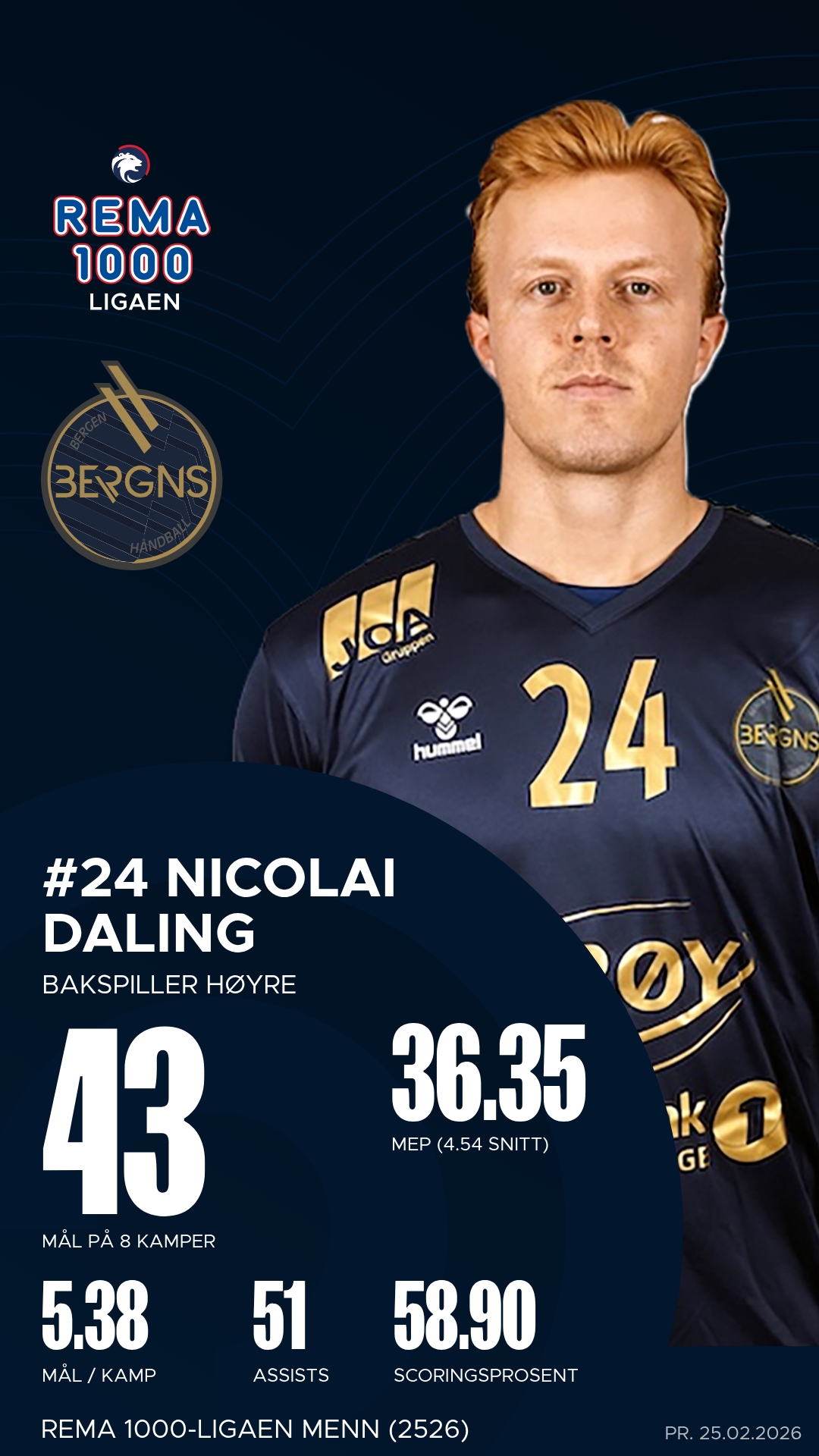 Nicolai Daling ble den mest effektive spilleren på banen for Bergen med hele 12 mål og flere avgjørende bidrag i sluttminuttene. Han fikk god støtte av Torger Edland, som var en motor i angrepsspillet med 13 målgivende pasninger, og av Ciljan Sagosen som styrte rytmen fra midten. Daniel Dimitrijevic leverte en sterk kamp fra venstrekanten med åtte fulltreffere og høy treffsikkerhet.